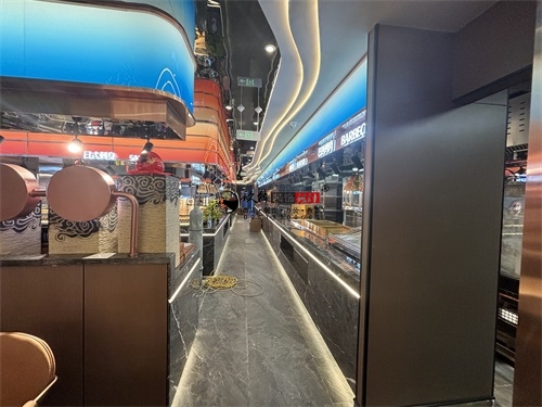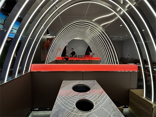 今天分享的是隆德回香渔自助餐厅装修设计实景照片,整体而言,这家自助餐厅装修设计上精准踩中了“年轻时尚+功能实用”的餐饮装修趋势:用流动曲线、霓虹光影打造网红属性,用材质平衡、分区布局满足自助餐饮的实际需求,既适合朋友聚会的休闲场景,也能通过空间质感提升品牌调性。材质搭配上,自助餐厅采用“冷硬工业风+柔和轻奢感”的平衡策略:地面与餐台基座选用深色大理石与金属质感的饰面板,强化了空间的感与耐磨实用性;而卡座沙发、餐椅则采用暖橙色的软包材质,中和了石材与金属的冷硬,同时通过金属细框的椅架设计,保留了轻奢调性。